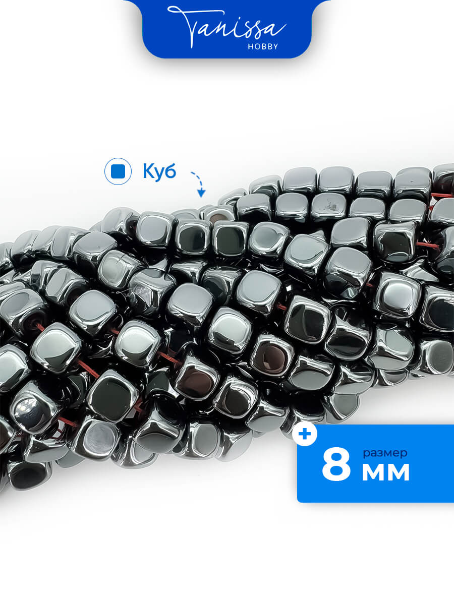 Гематин гематит бусины куб квадрат 8мм, черный, нить, ГТ098
