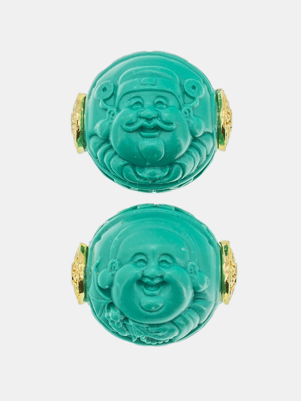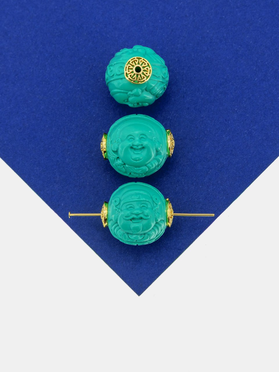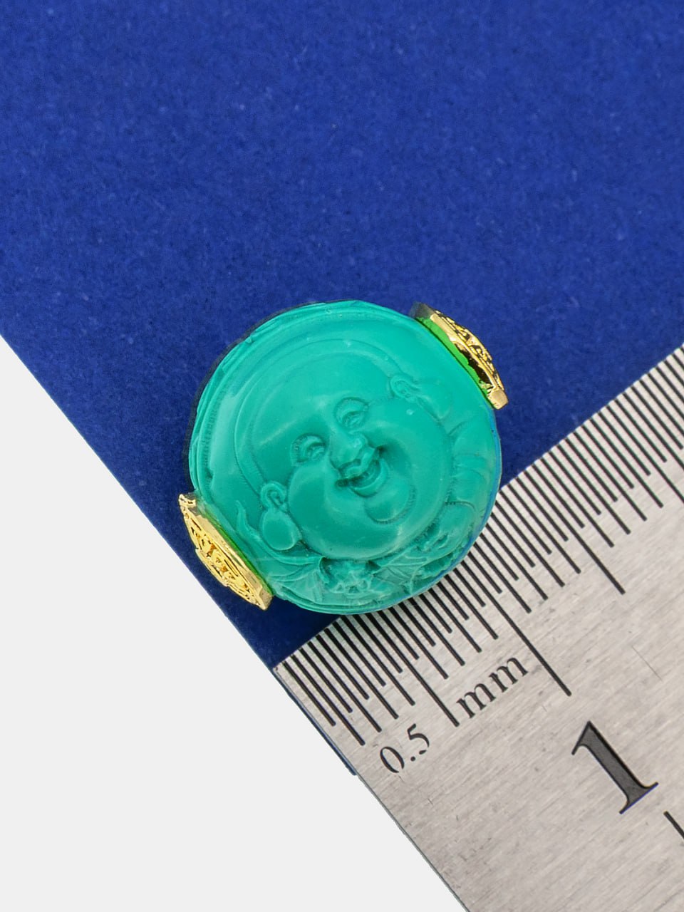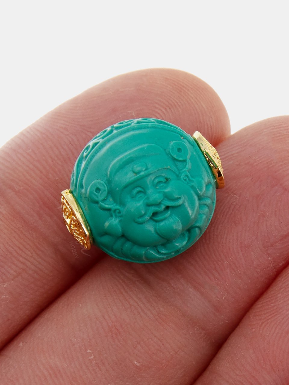 Бусина в буддийской тематике из натуральной бирюзы, укрепленной смолами, с позолотой.