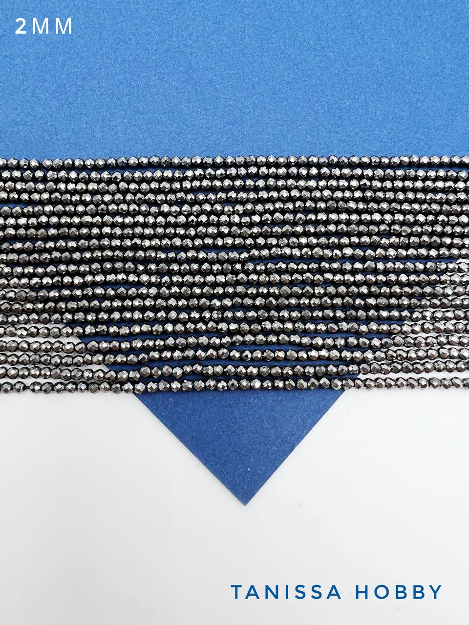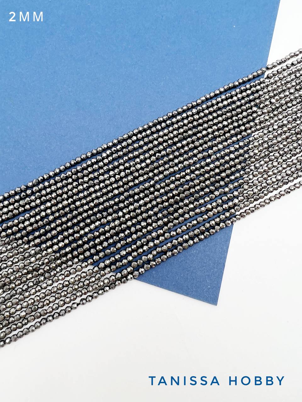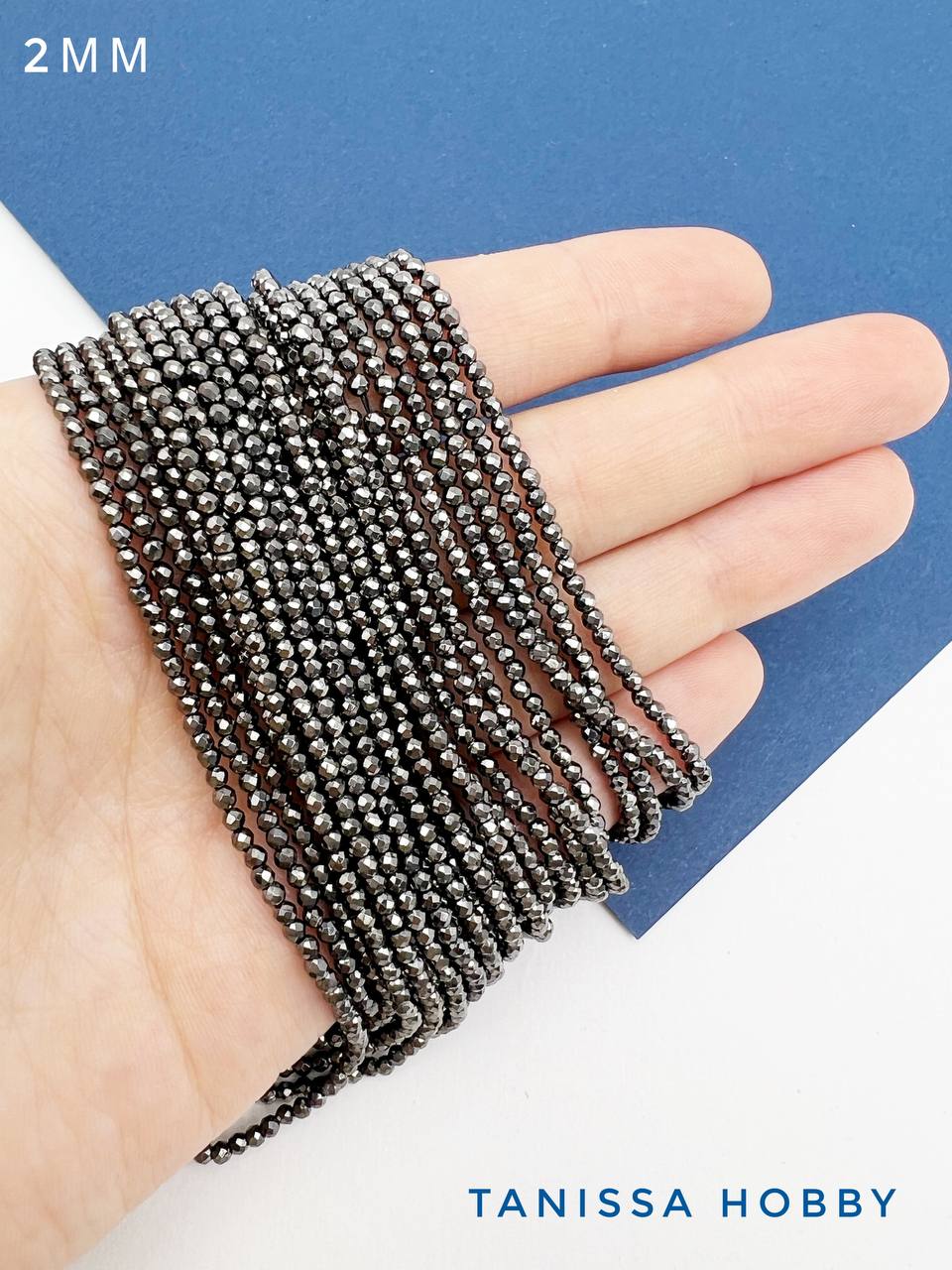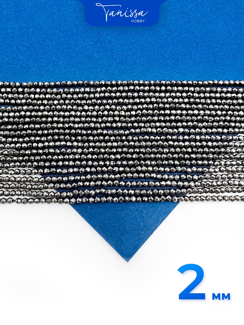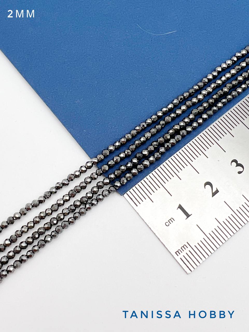 Гематит, гематин, огранка, бусины круглые 2мм, темный серый, нить, ГТ053