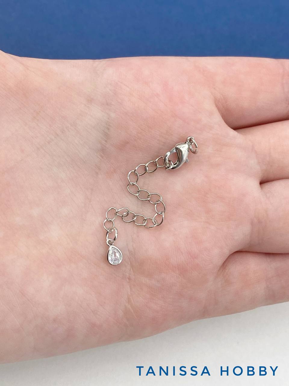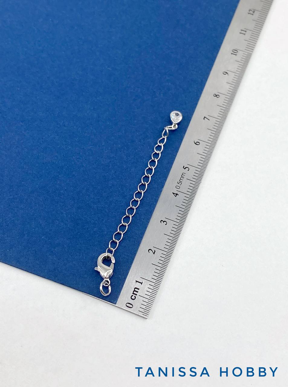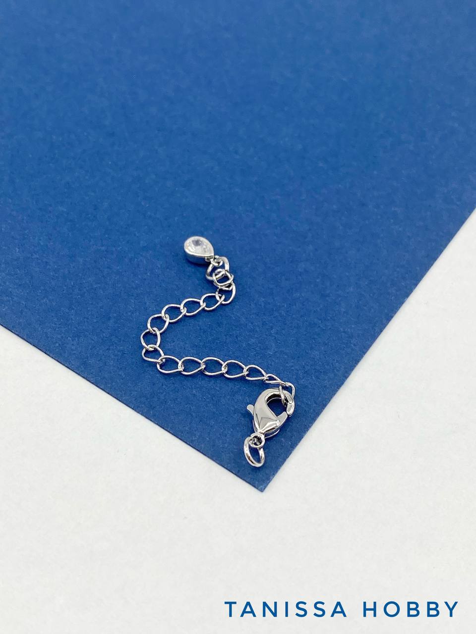 Карабин замок лобстер, 10х5мм, с цепочкой удлинения и фианитом, родий, КР015