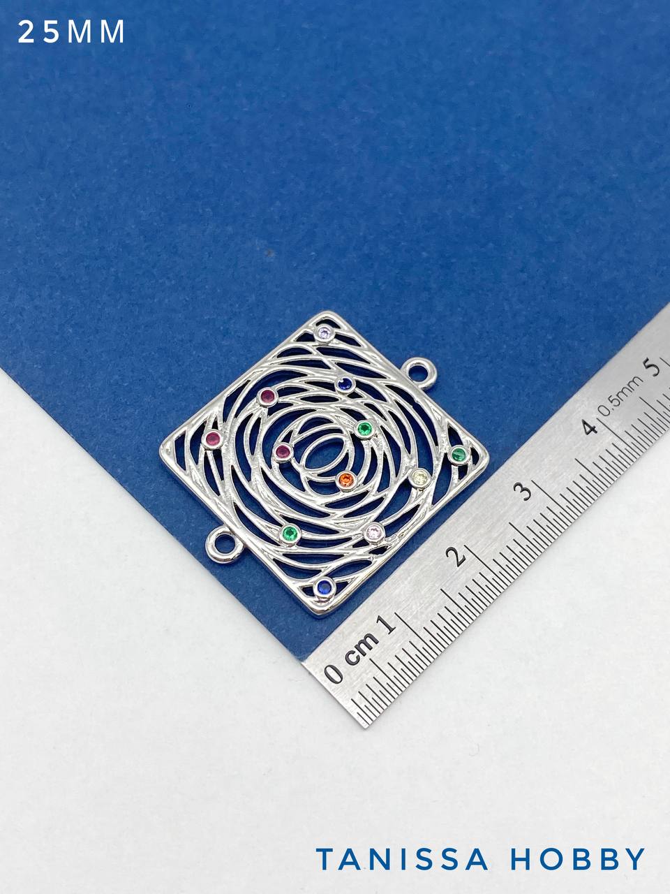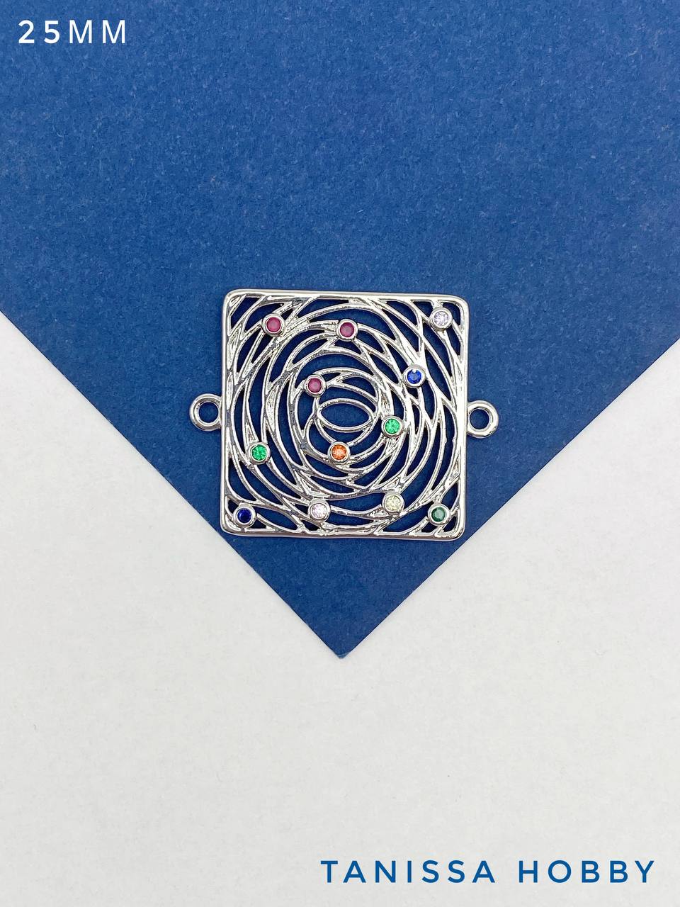 Коннектор квадрат с цветными фианитами, 25мм, родий, Ю830