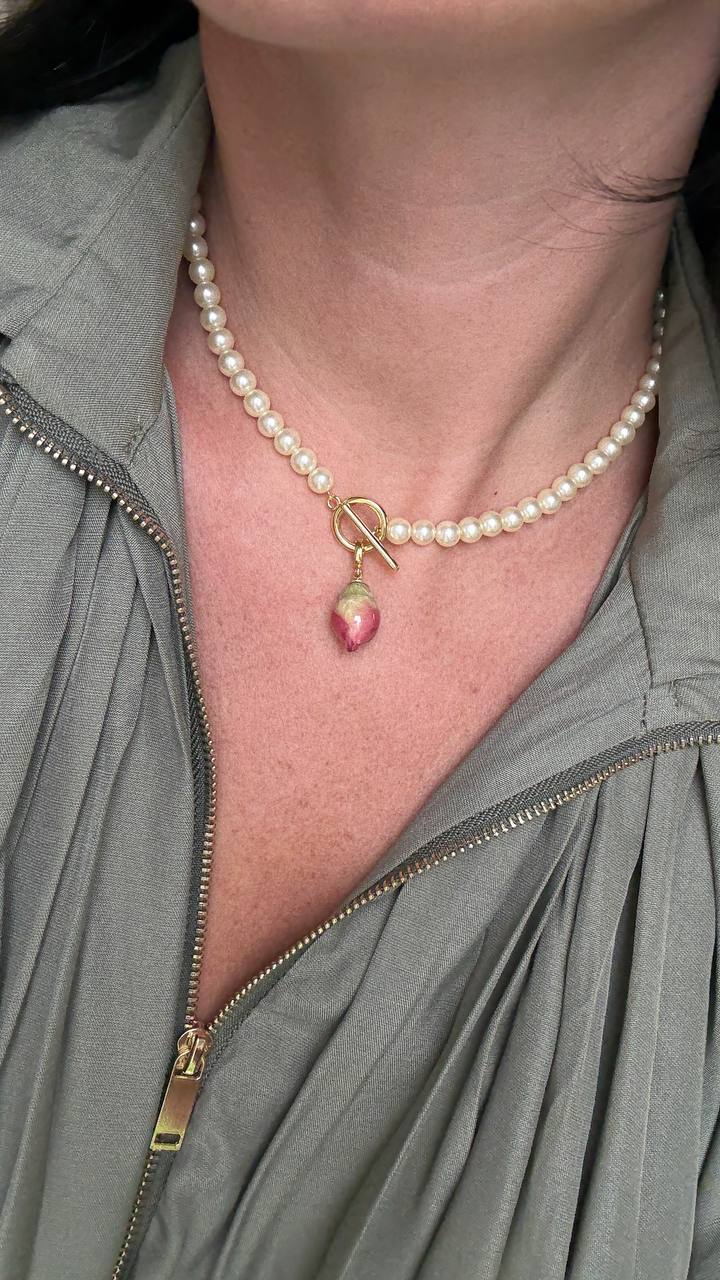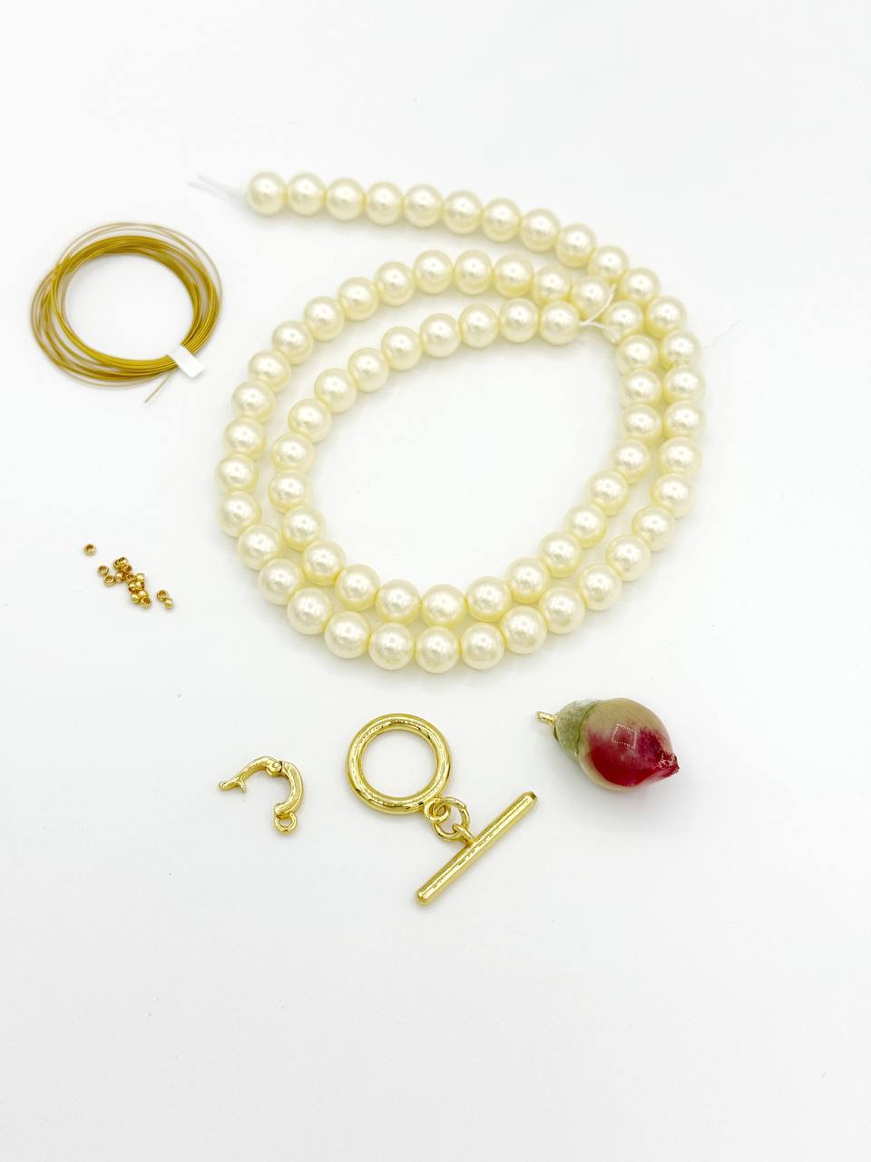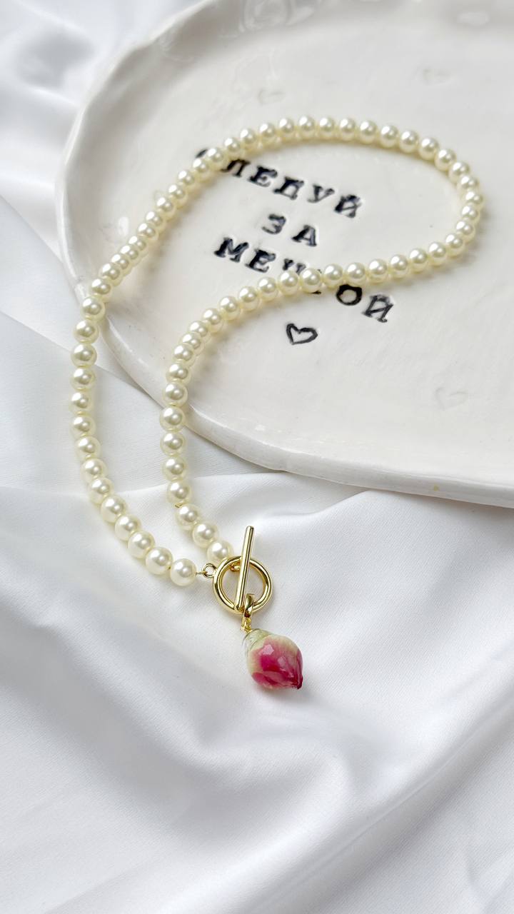 Набор в золотистом оттенке фурнитуры включает в себя комплект материалов, из которого можно создать роскошный чокер с подвеской из настоящего бутона розы в эпоксидной смоле.