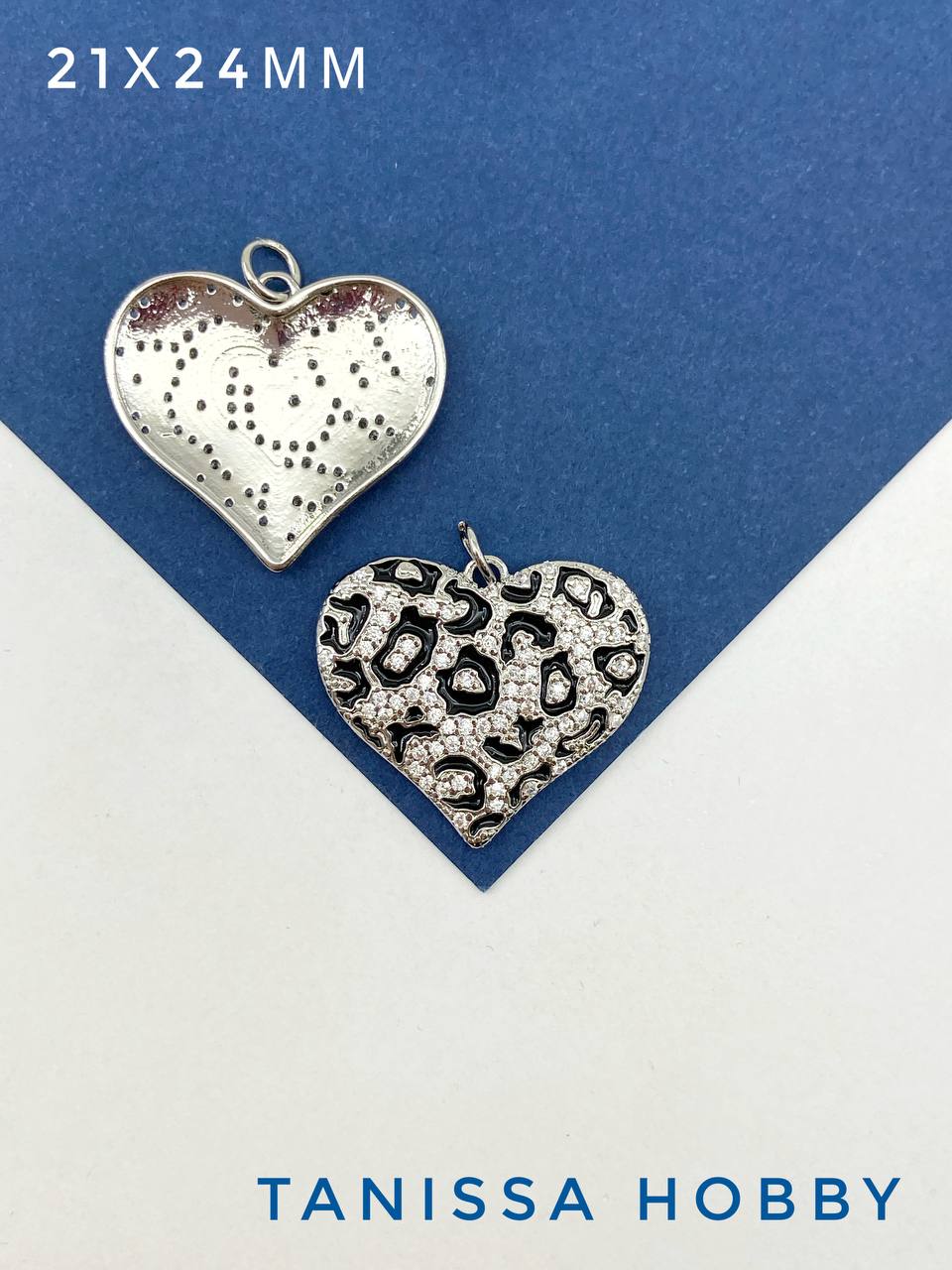 Подвеска сердце леопард с фианитами, 21х24мм, родий, Ю503