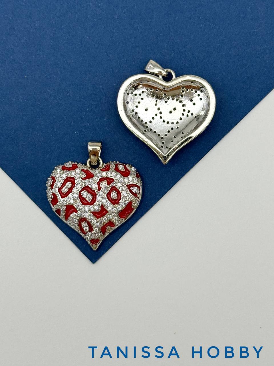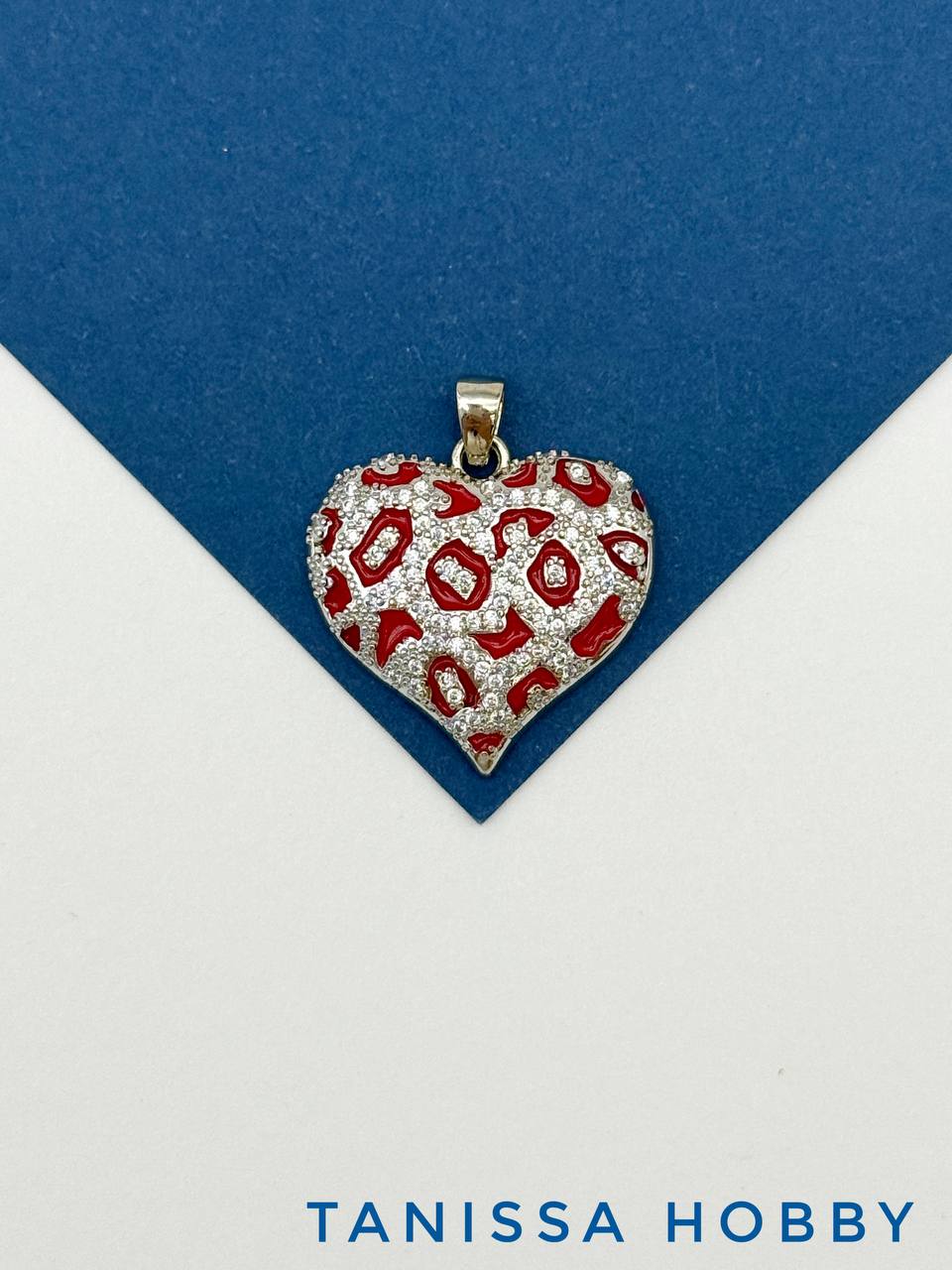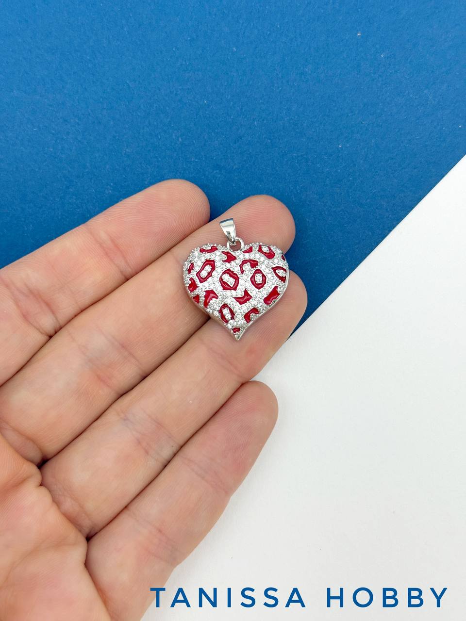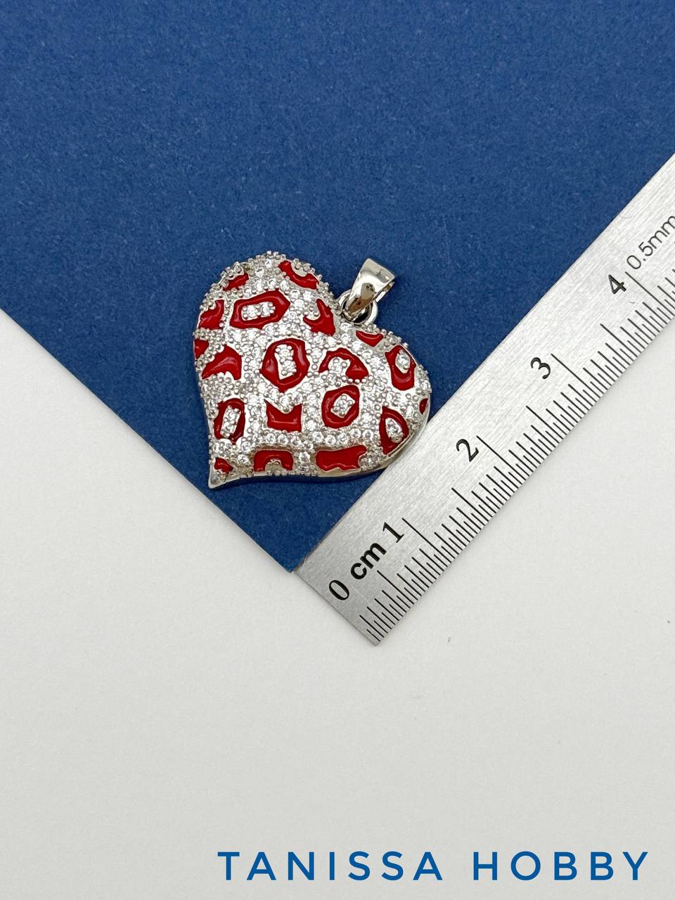 -Подвеска сердце леопард красный с фианитами, 23мм, родий, Д527