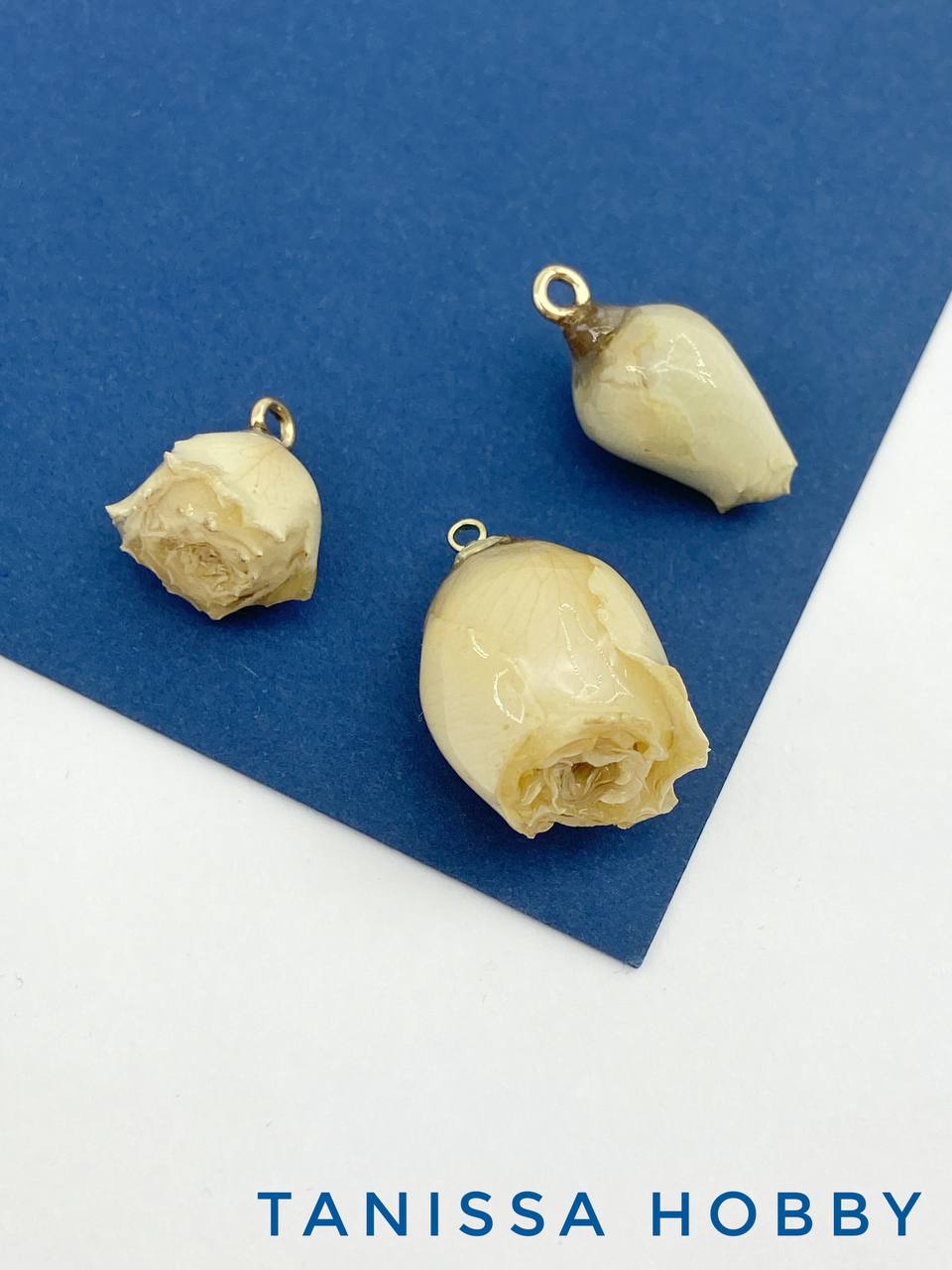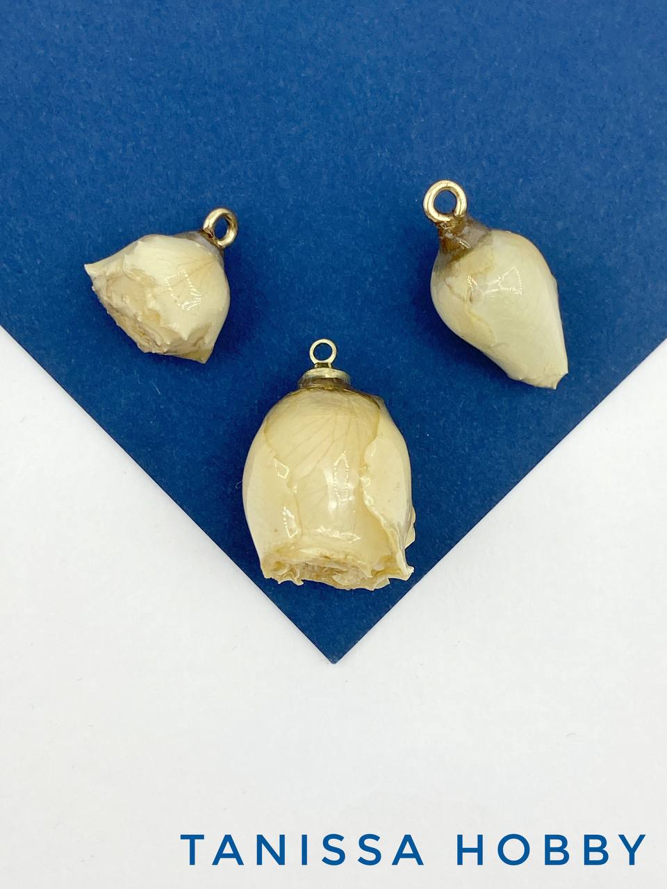 Подвеска цветок, бутон, роза в смоле, белый, позолота, П003