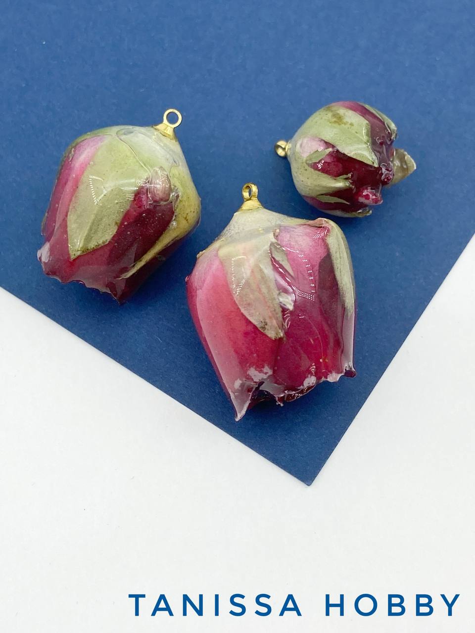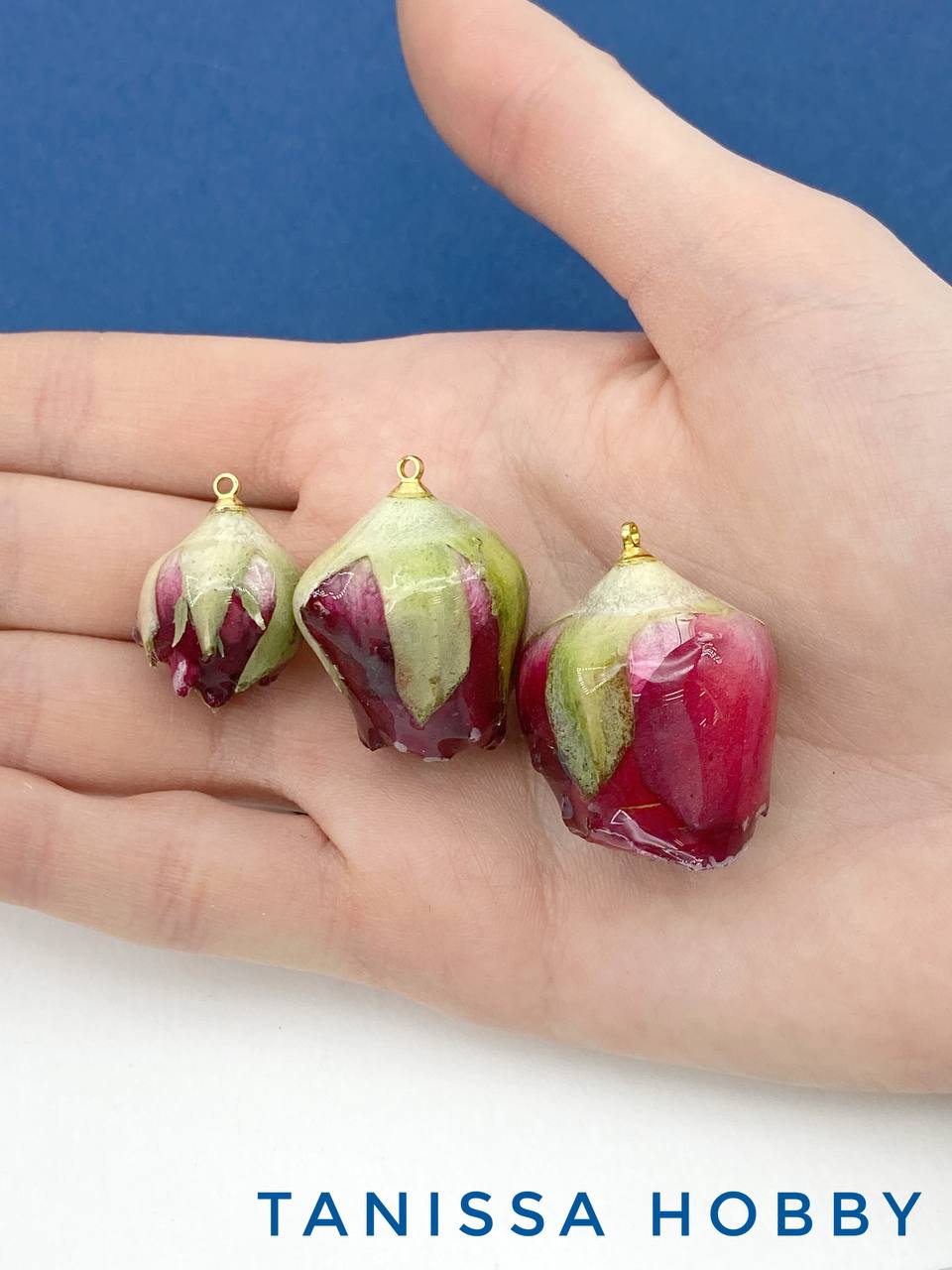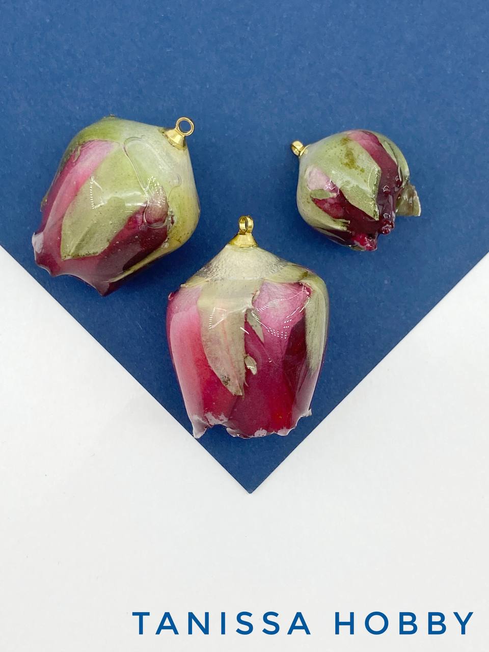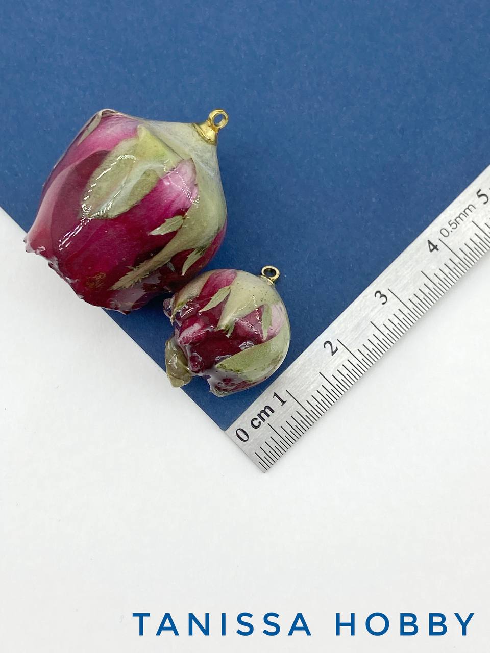 Подвеска цветок, бутон, роза в смоле, бордовый большой, позолота, П018