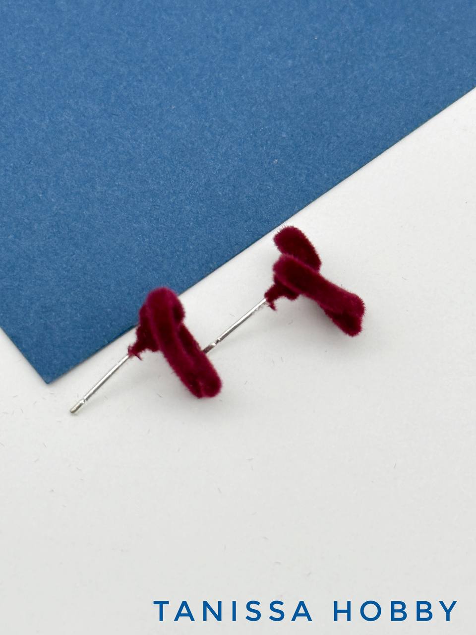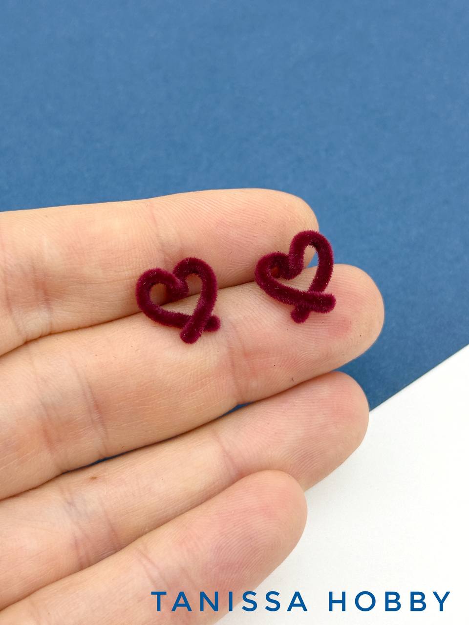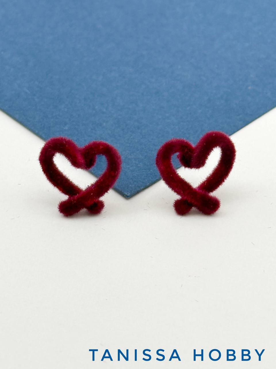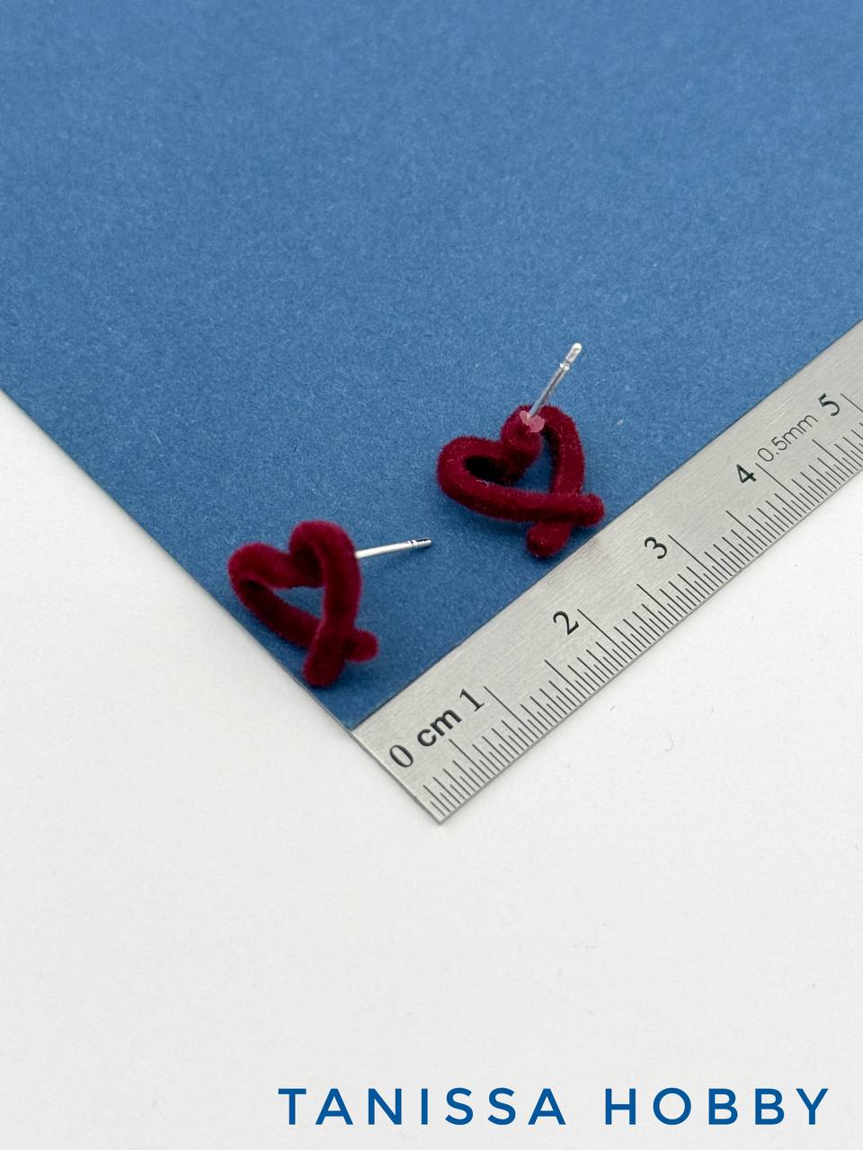 Швензы пусеты плюшевое сердце, бордовый бархат, Е527