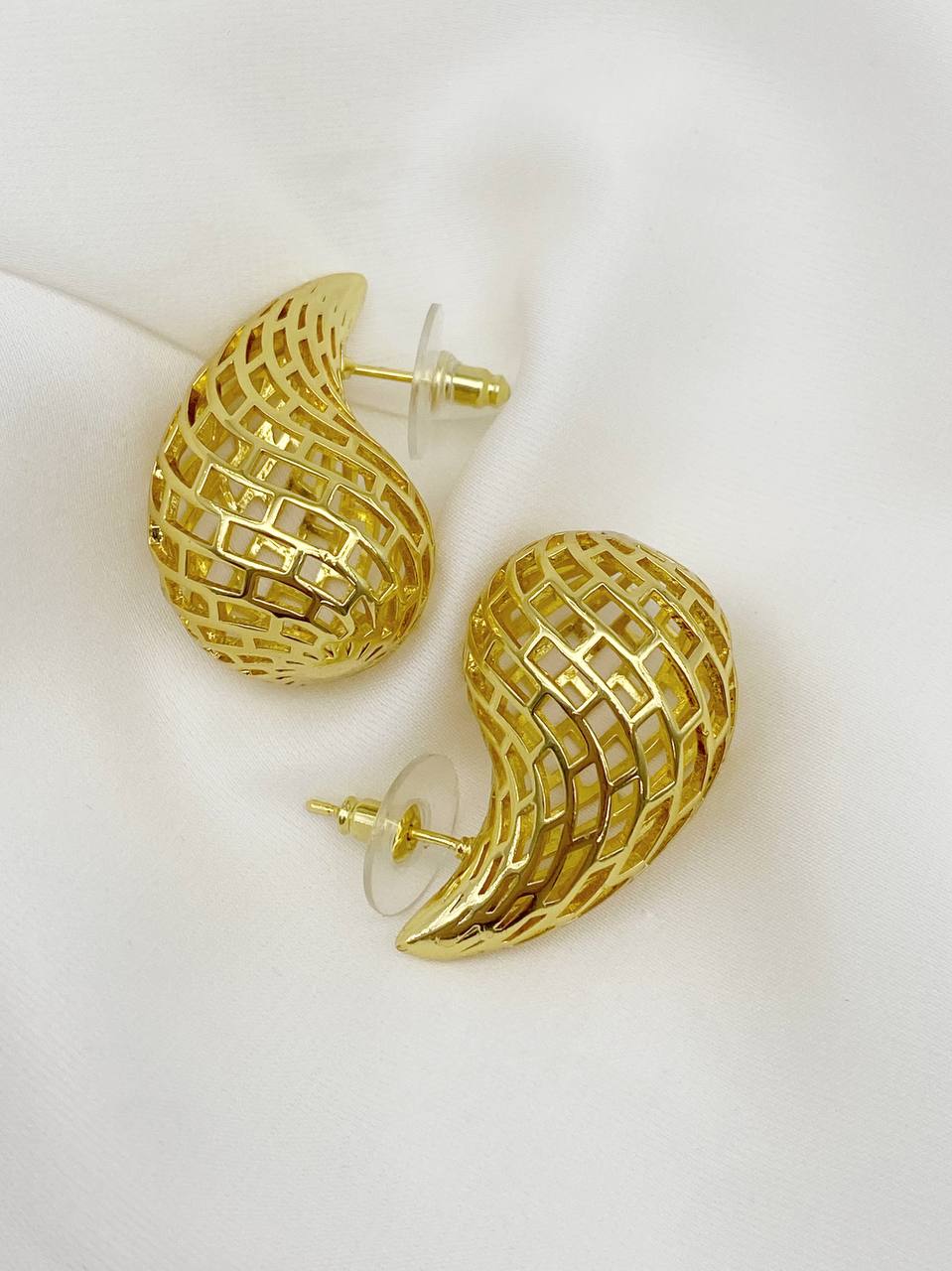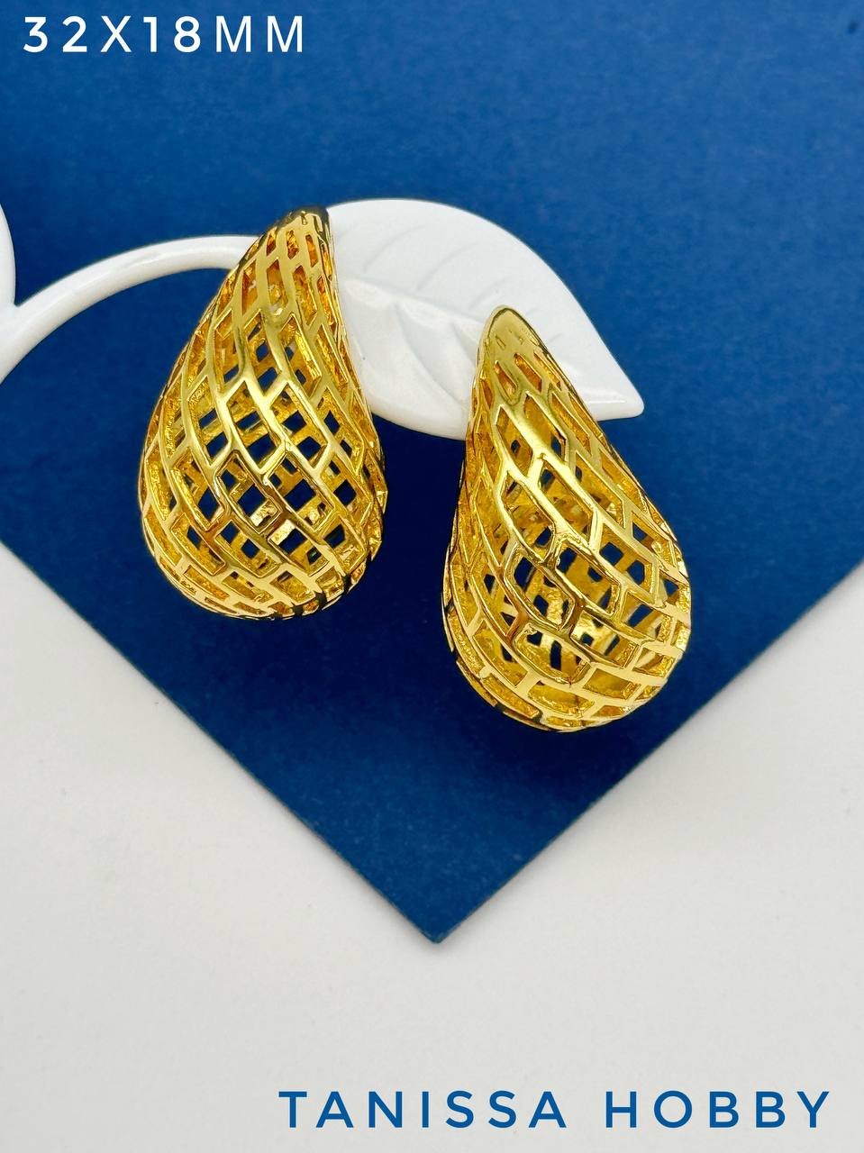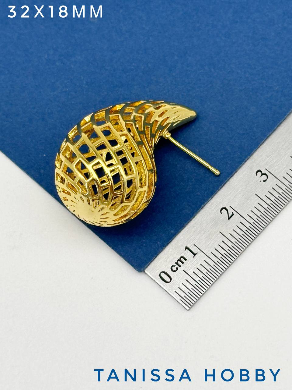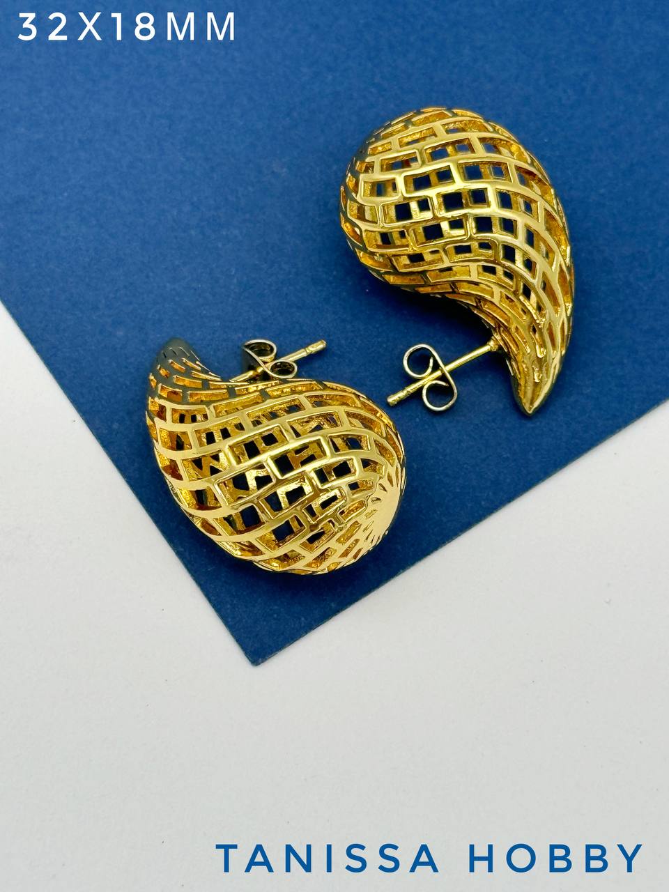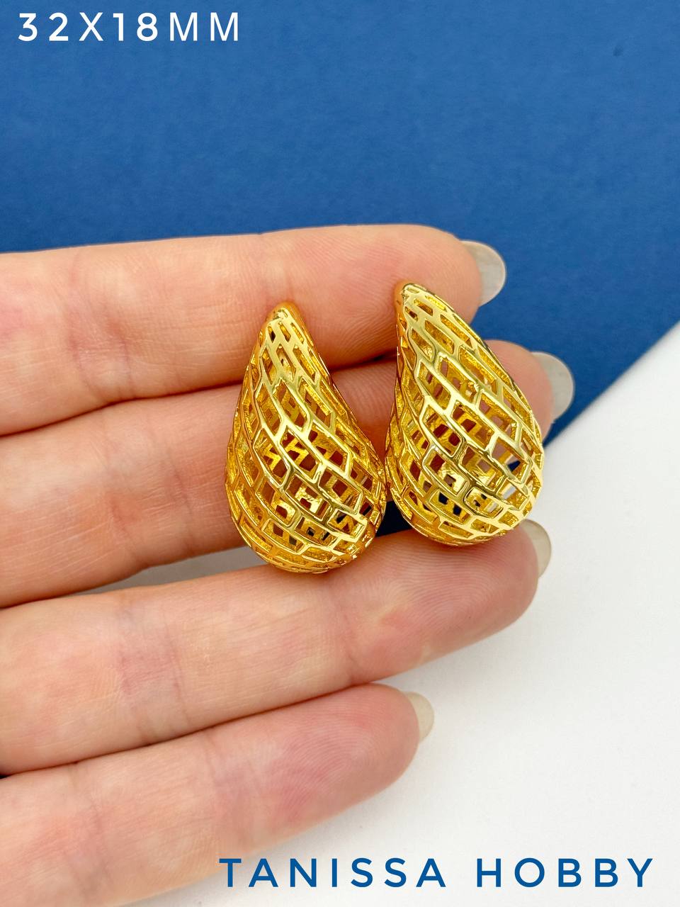 -Серьги пусеты капли узор, 32х18мм, позолота, 941