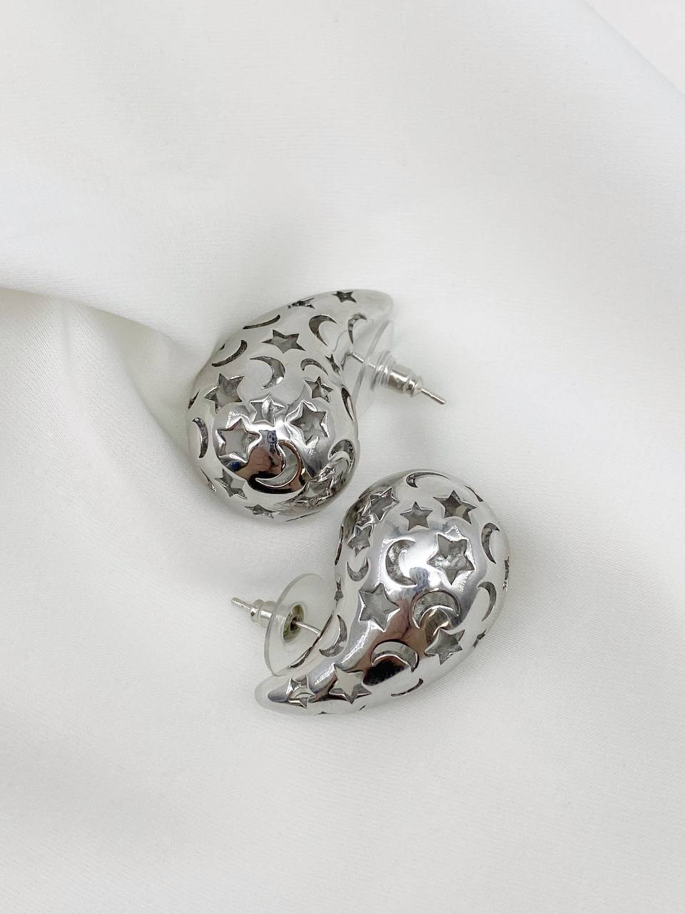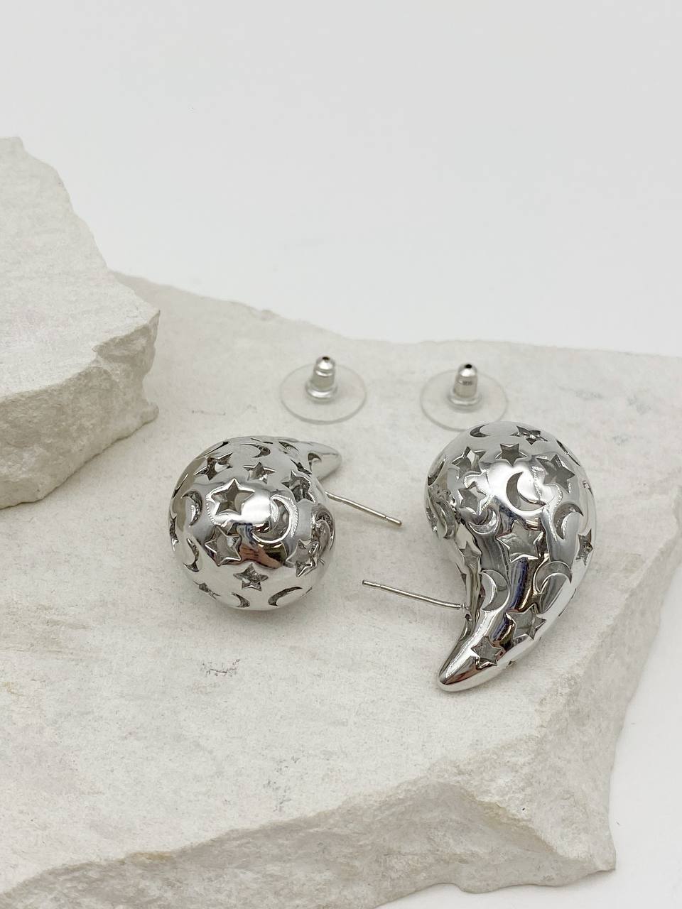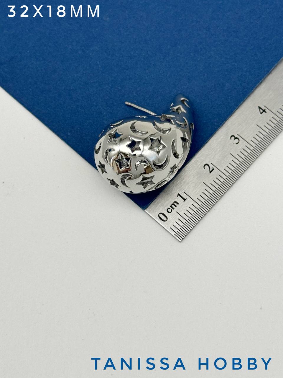 Серьги пусеты капли узор звезда, 32х18мм, родий, 985
