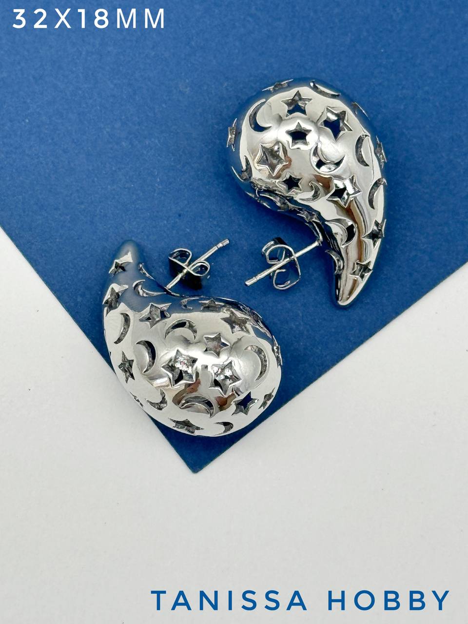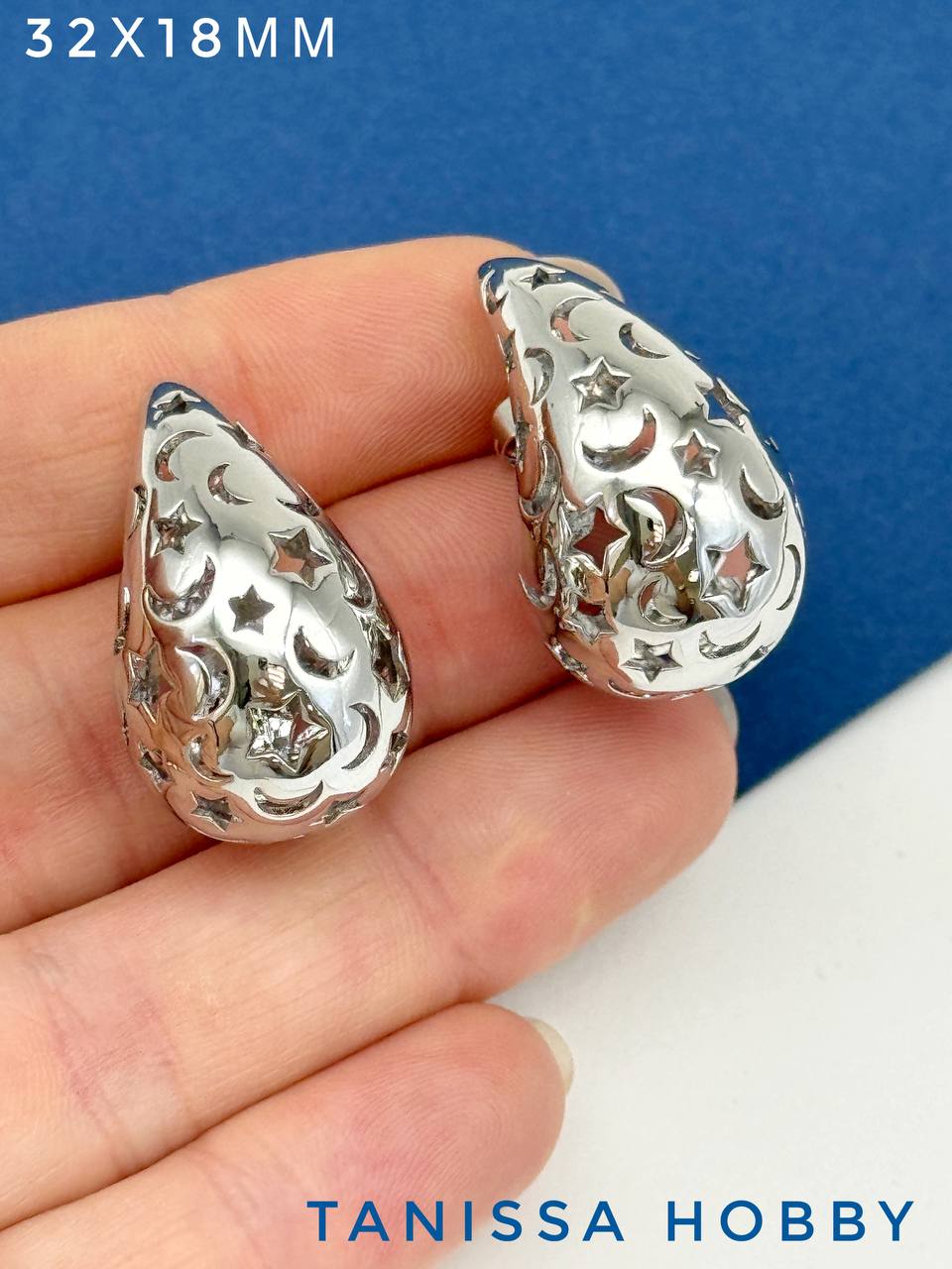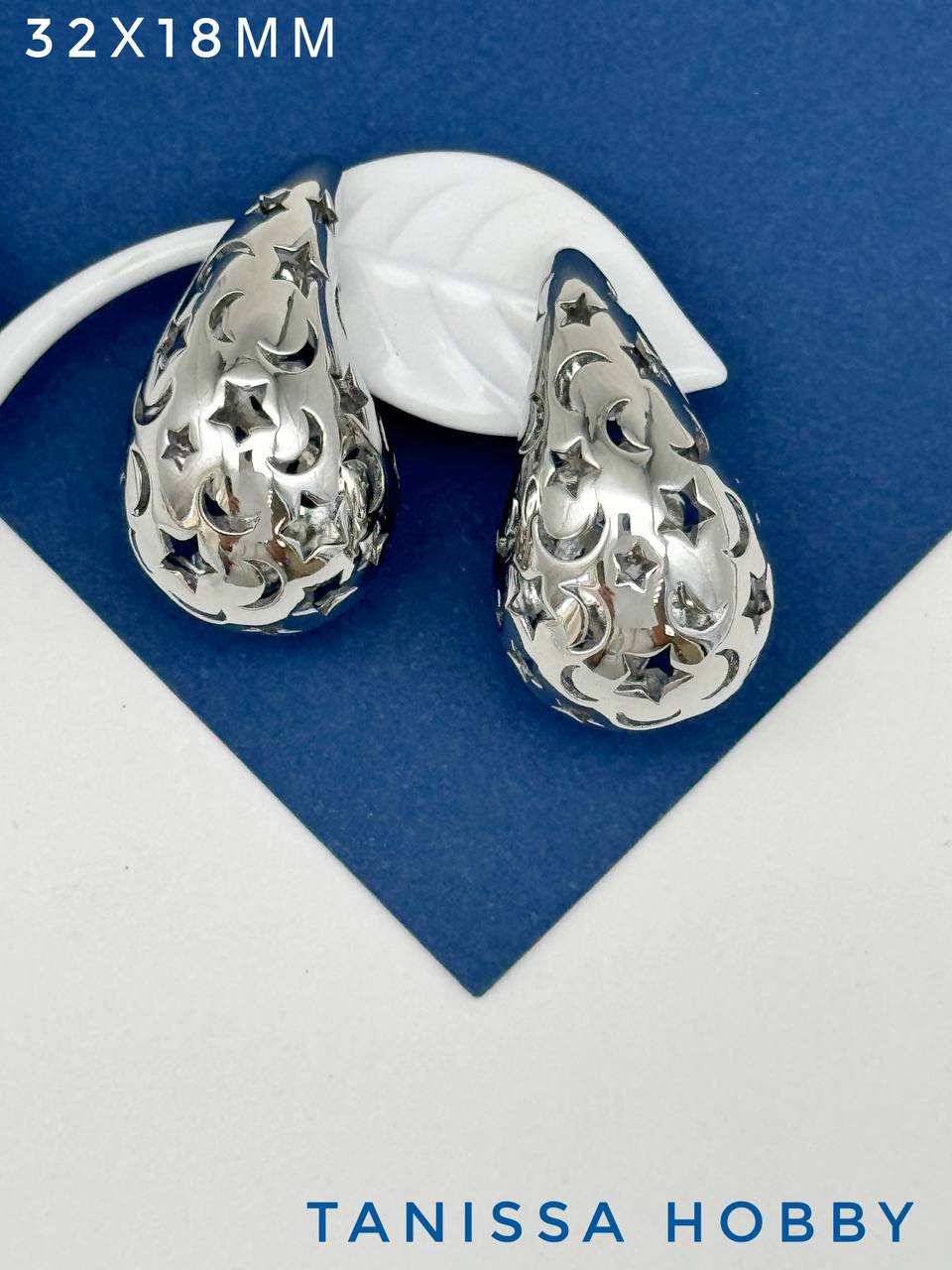 Серьги пусеты капли узор звезда, 32х18мм, родий, 985