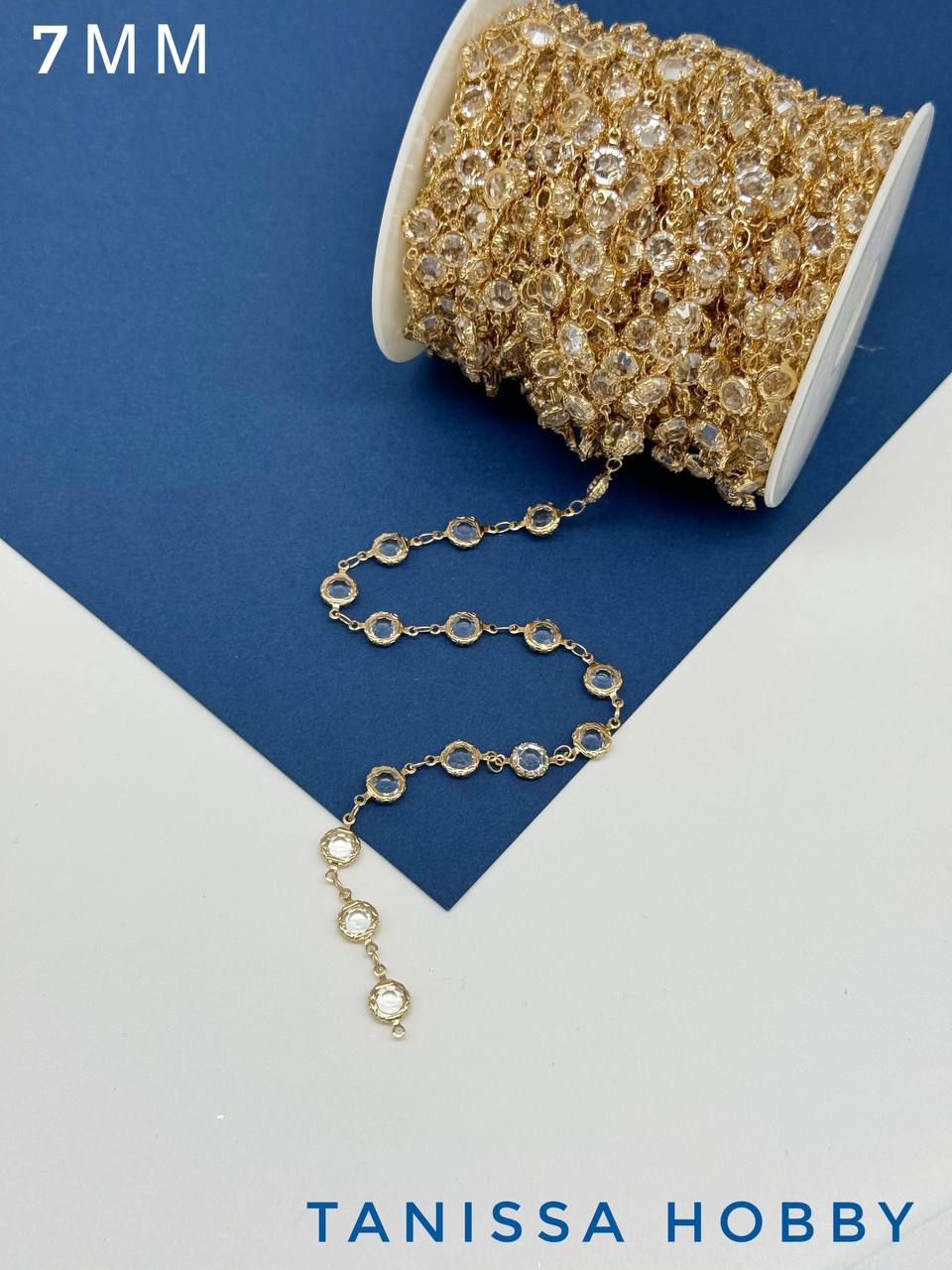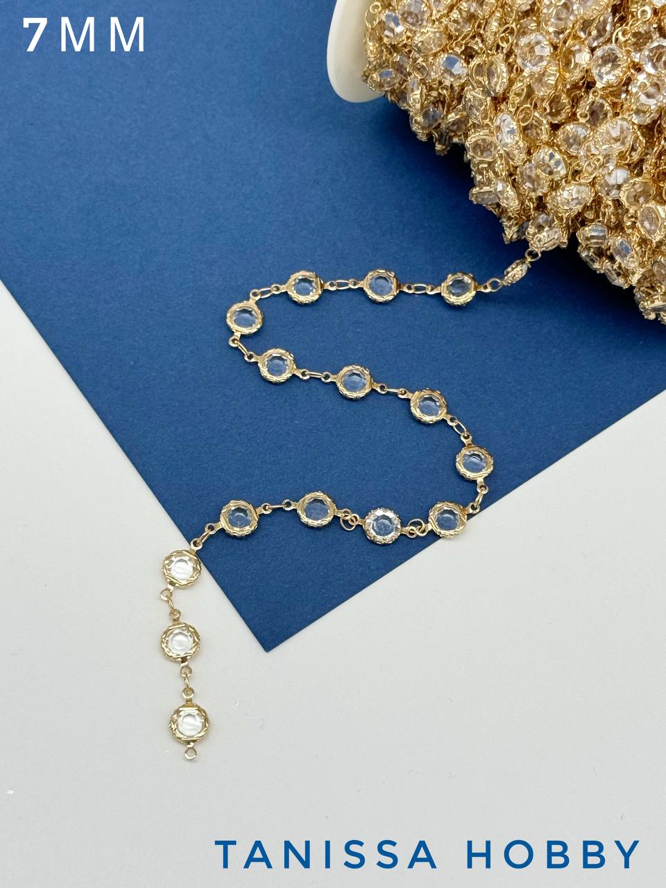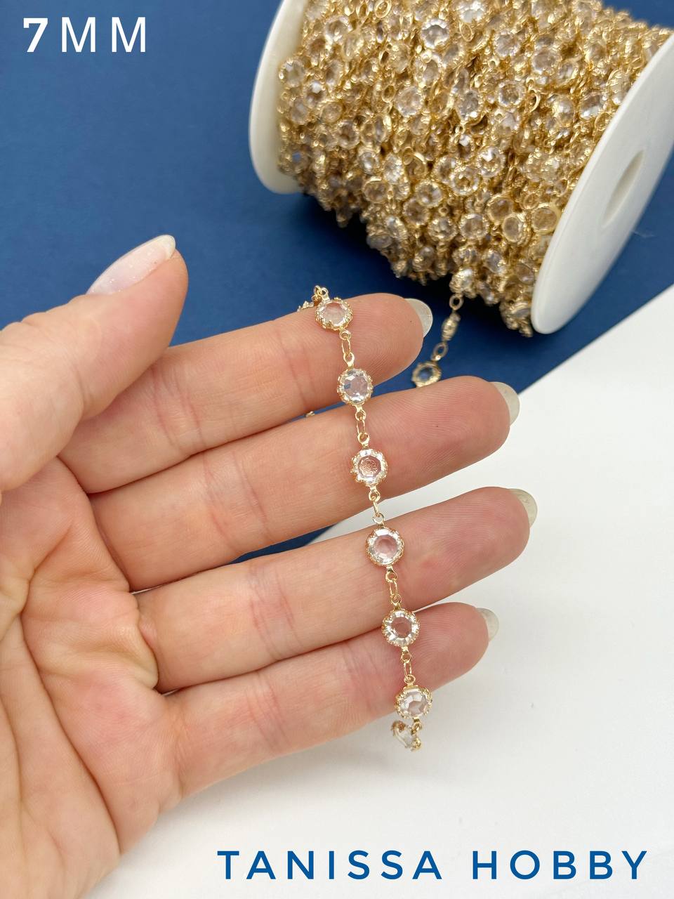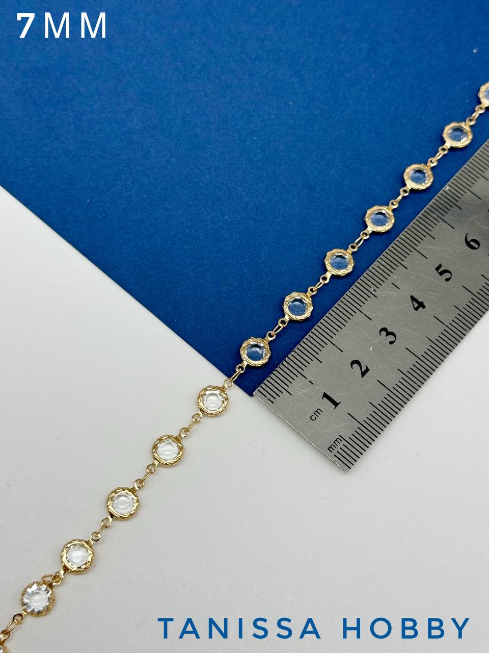Цепочка тонкая, хрусталь 7мм, прозрачный, 50см, позолота, СН206